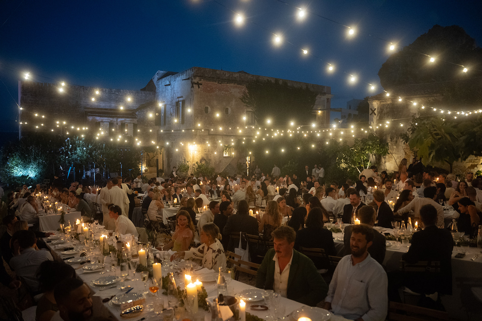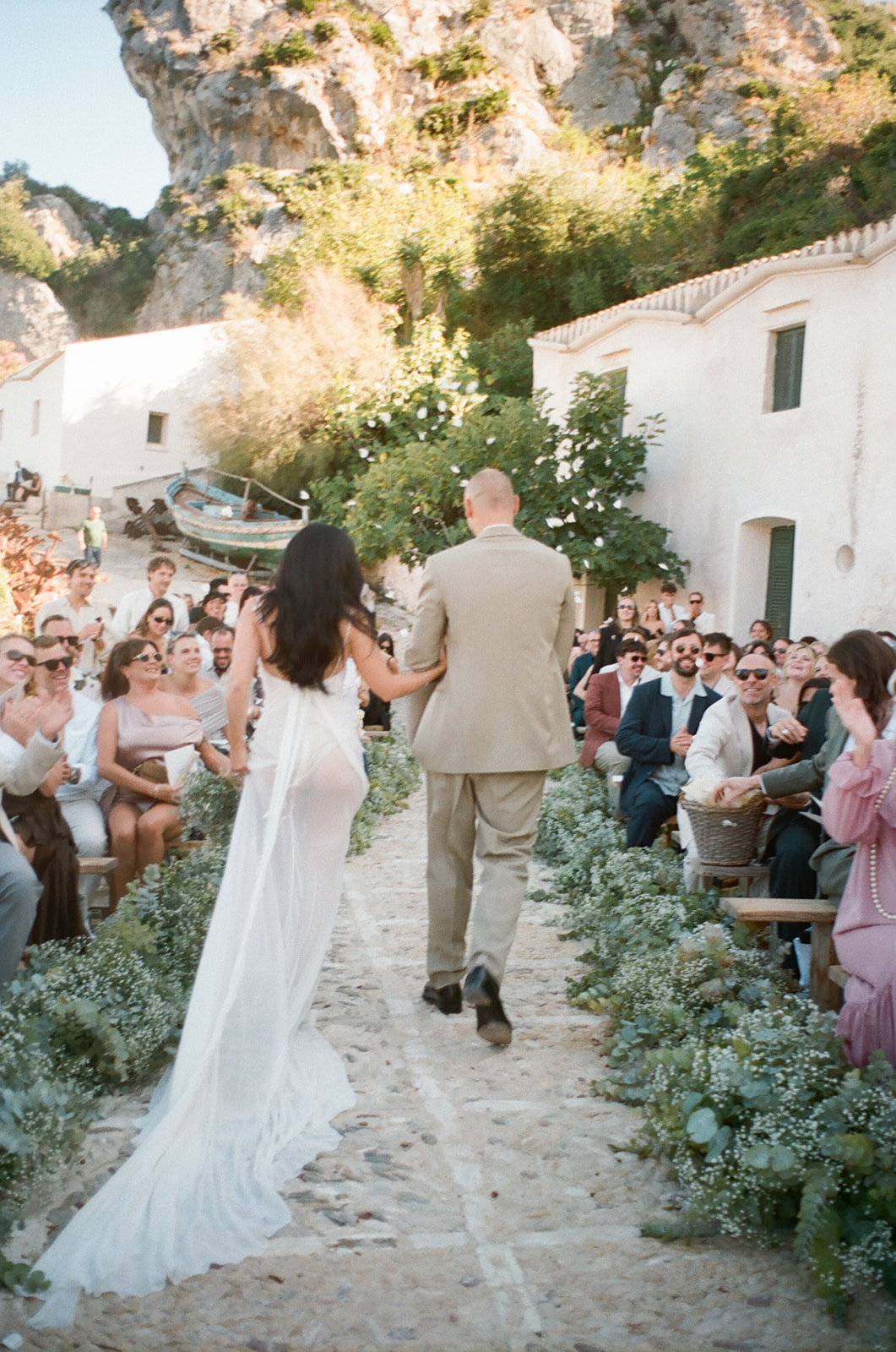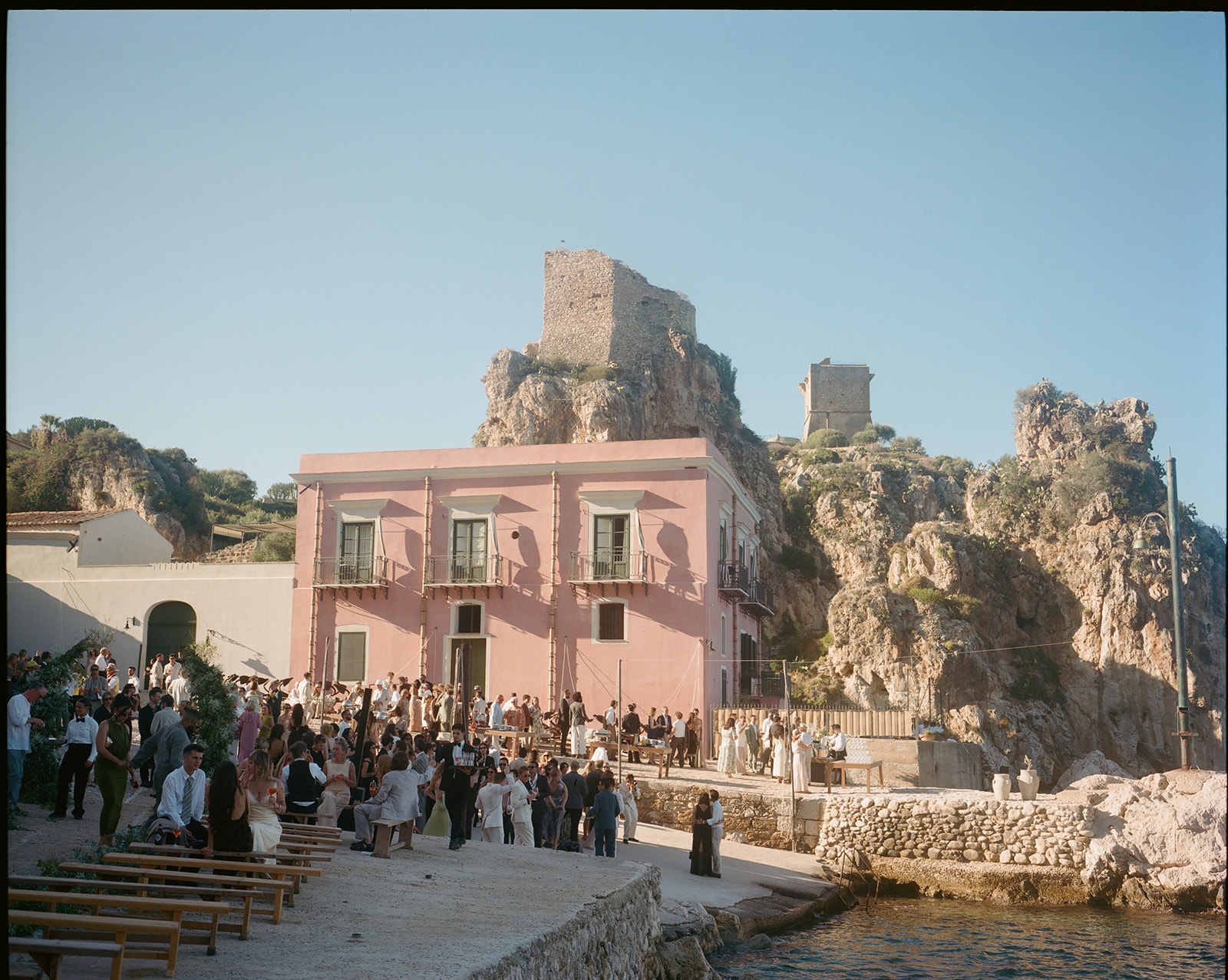 The bride wore Vivienne Westwood, with the groom’s suit and her bespoke veil designed by Kim Jones of Fendi & Dior. 300 guests descended on the 18th Century Tonnara near Palermo for a weekend of celebrations under the Sicilian sunshine. Colourful daytime fireworks were let off to Primal Scream’s ‘Come Together’ at the end of the beautiful ceremony by the water. Damien Lazaras and Lady Mary Charteris took to the decks on Saturday night and kept guests dancing until dawn.
